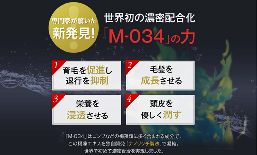 岐阜本巣研究所(情報なし)という機関の調べではミノキシジルと同等の効果があるとメーカーサイドで謳っておりますが、論文の公表もなくこれに関しては眉唾もの。「M-034」が効果的な方にはおすすめです。