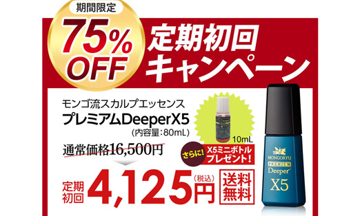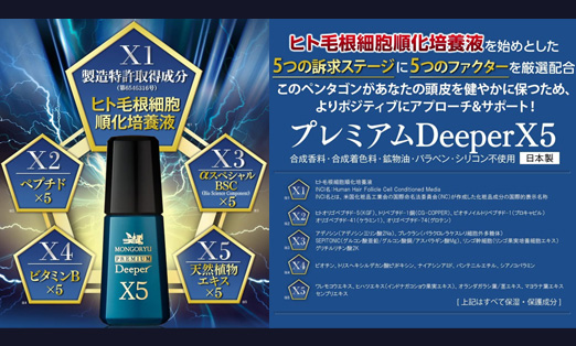 子供にパパ、ハゲてるよと言われたのが購入のきっかけです(爆)普段自分では後ろ姿なんてほとんど見ないし、散髪も1000円カットの適当なところで済ましていたので全く指摘されませんでした。子供に言われハゲに気がついた私は、急いでネットで育毛剤について調べることにしました。キャピキシルという成分が相当生えそうだということで、このDeeperX5を使う事にしたのですが、付けたかんじは、すっと頭皮に浸透しているかんじで使い心地はなかなかです。半年続けて確かに全体的に髪の毛が濃くなってきたような気がします。子供に後ろの髪どう?と聞いても特にハゲてるとか言われなくなりました。いつまでも若々しいパパでありたいので、今後もDeeperX5続けて行く予定です。
