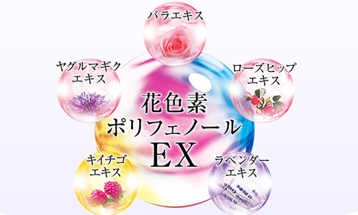 その中から期待できる5種(バラ、ヤグルマギク、ローズヒップ、キイチゴ、ラベンダー)のエキスを組み合わせたものが上述の花色素ポリフェノールEXとなります。