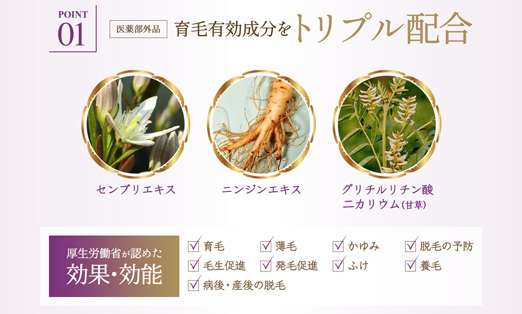 育毛、薄毛、かゆみ、脱毛の予防、毛生促進、発毛促進、ふけ、養毛、病後・産後の脱毛