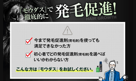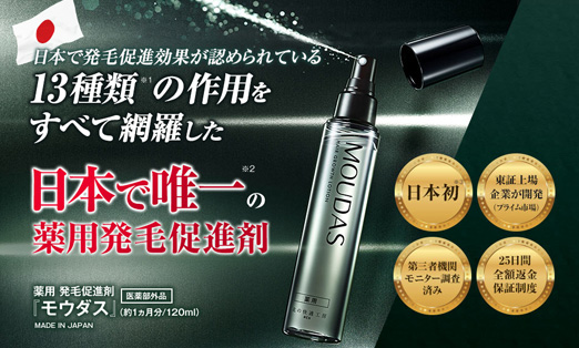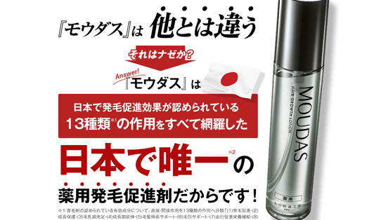 もちろんです!モウダスは、日本で唯一の薬用発毛促進剤です。発毛促進に寄与する成分が5種類も配合されており、13種類の発毛促進作用を全て網羅しています。「これでダメなら諦めがつく」というキャッチコピーで注目されています。