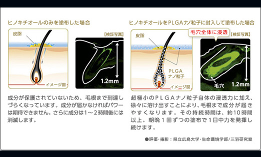 「PLGAナノ粒子」と「PCTナノエマルジョン」という2種類のナノ浸透を用い、有効成分である酢酸DL-α-トコフェロールとセンブリ抽出液を毛穴の奥へ浸透させます。