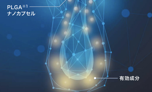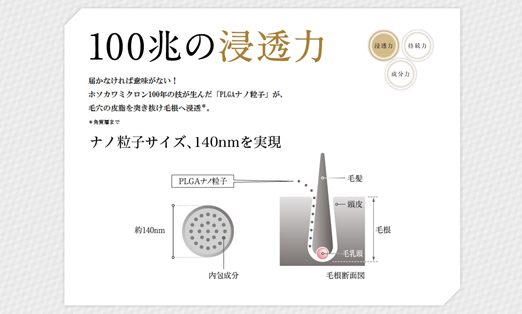 ホソカワミクロン100年の技が生んだ140nmにまで縮小されたPLGAナノ粒子百兆個は毛穴のすみずみに12時間以上留まります。