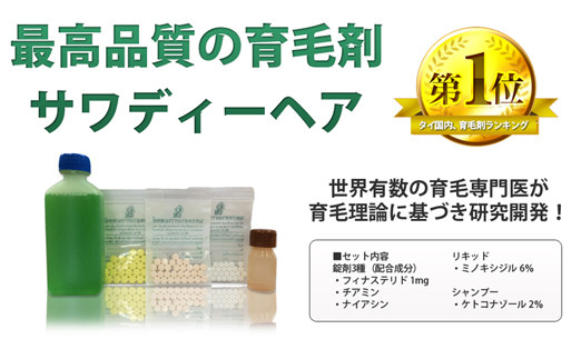 サワディーヘアーフィナステリドの錠剤とミノキシジルリキッド(男性用は6%、女性用は2%)にケトコナゾールシャンプーがセットになった医薬品フルセットとお考えください。