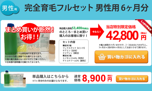 ミノキシジルリキッド6%とフィナステリド・チアミン・ナイアシンの錠剤とフケとりシャンプーがセットになったタイの育毛キットです。バラバラに個人輸入するより大分安く済みます。よほどブランドにこだわりがあるとか、AGAクリニックで処方されたものでないと安心できないという方でなければこのセットで十分に事足りるはずです。これとミノタブの10mgを個人輸入すれば完璧です。これで生えなかったら諦めるしかありません。半年分をまとめ買いすると更に一万円位安くなるし簡単なので、私は半年分一度に購入しています。