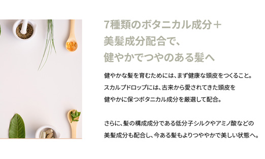 製薬会社と共同開発された「SCALP DROP」は、男女共通の抜け毛・薄毛の原因である頭皮環境の悪化に、4つの医薬部外品有効成分がしっかりアプローチすることで発毛を促進し、年齢と共に細く薄くなった髪を太くしなやかに育てる育毛剤です。4種の有効成分が抜け毛・薄毛の主な要因・毛周期の乱れにしっかりはたらきかけ、太くしなやかな発毛を促進します。さらに炎症や過剰な皮脂分泌を抑えることで、頭皮の不快臭も抑えます。また、7種類のボタニカル成分が含まれており、頭皮に潤いを与えて頭皮環境をしっかりサポートし、健やかな髪を育むための基盤を整えます。