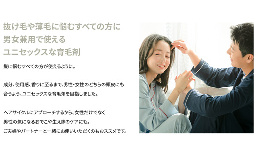 そうです。これらの成分が協力し合って、頭皮環境を整え、髪の成長を促進します。 他にも美髪成分やボタニカル成分が配合されており、より効果的な育毛ケアが期待できます。ご夫婦やパートナーと一緒に使ってもらえるジェンダレスな育毛剤です。