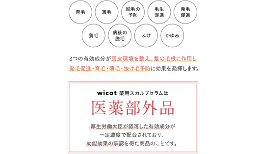 承知しました!wicot(ウィコット)は、日本初のオーガニック認証を受けた女性向けの薬用育毛剤です。 刺激に弱くデリケートな女性の頭皮のために、天然由来原料94%、オーガニック原料74%で作られています。発毛促進・育毛・脱毛予防の効果がありますし、かゆみやふけ、炎症などの頭皮トラブルにも効果があります。