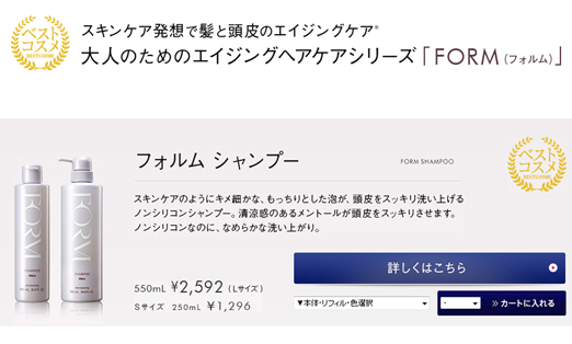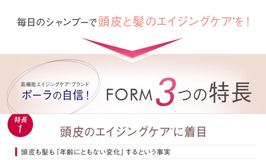 フォルムシャンプーは私どもポーラ化粧品のアンチエイジングに対する想いが詰められた、スキンケア発想のエイジングケアシャンプーです。